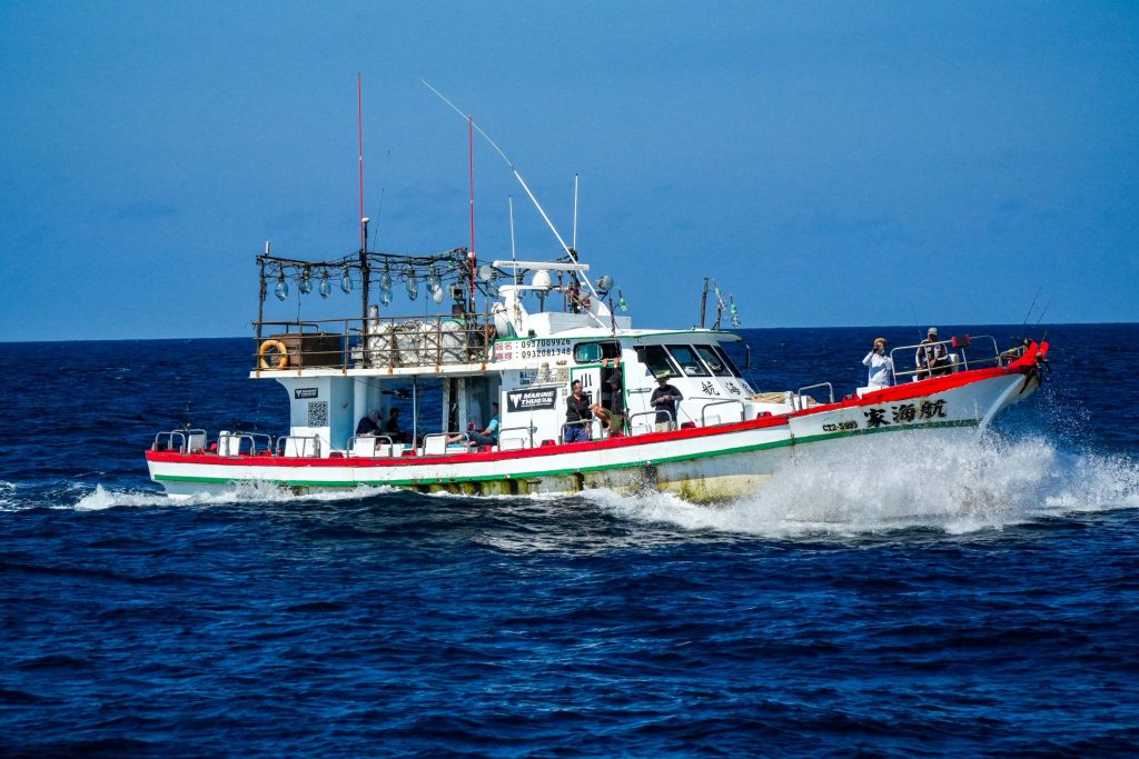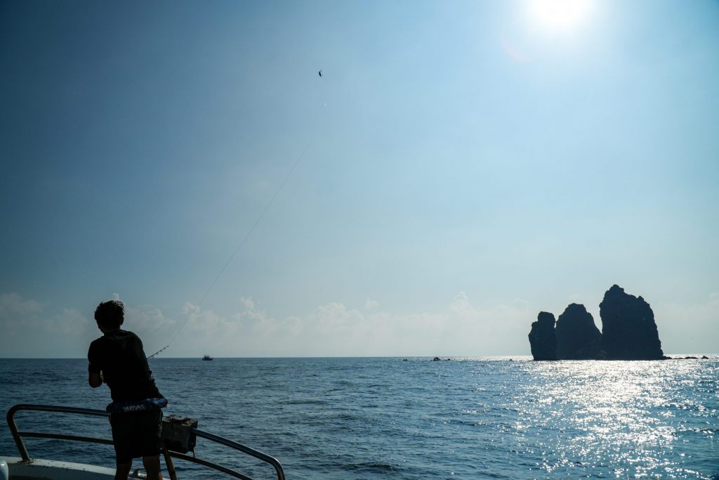 一日目に最も潮の流れがよく魚の気配もあったポイントに移動した。前日には見られなかった引っ張りの漁船がいる。台湾アングラーに聞けば、カツオを狙っているのだという。大型カンパチのベイトになるというカツオが再び回遊してきた可能性があるのだ。