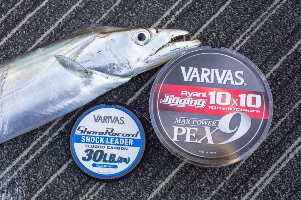 椙尾さんはアバニ ジギング10×10マックスパワーPE X9 0.8号、ショックリーダーはショアレコードショックリーダー[フロロカーボン]30lbを使用。